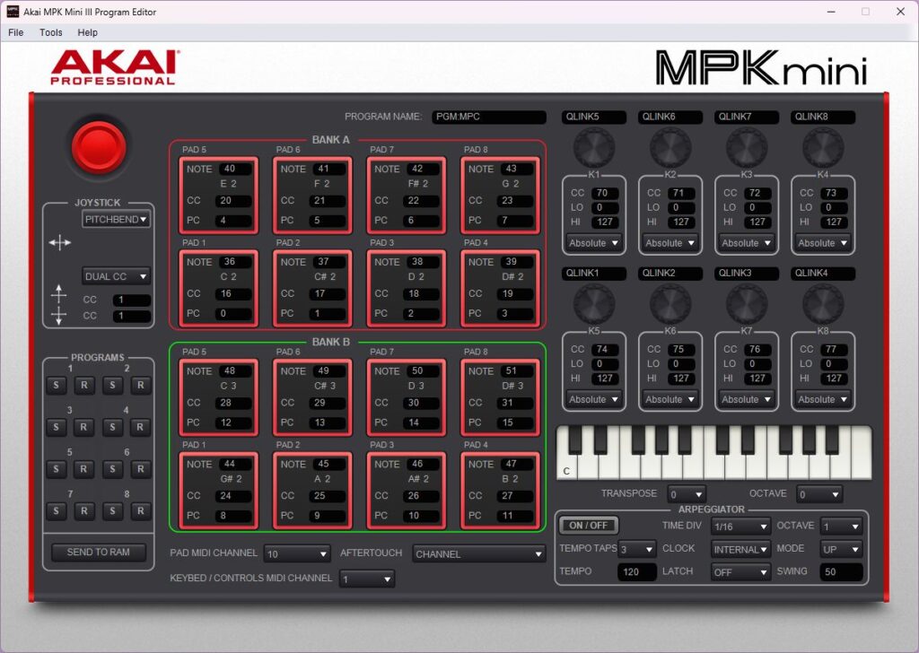 Um die volle Kontrolle zu haben über die Einstellungen am Keyboard, empfehle ich den offiziellen MPK mini 3 Program Editor von der AKAI-Webseite. Damit kann man ganz leicht den einzelnen Kontroll-Elementen feste CC-Nummern zuweisen, an das Keyboard senden und dann in der DAW und den Plugins mittels Learning gemappt werden. So auch die Joystick-Achsen.