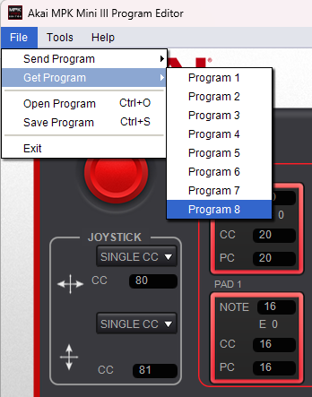 Das MPK mini kann 8 Programme speichern. Wir holen uns im Program Editor zunächst die Einstellungen des Programm-Slots vom Keyboard, dass wir ändern und überschreiben wollen. Für dieses Beispiel nehme ich Program 8.