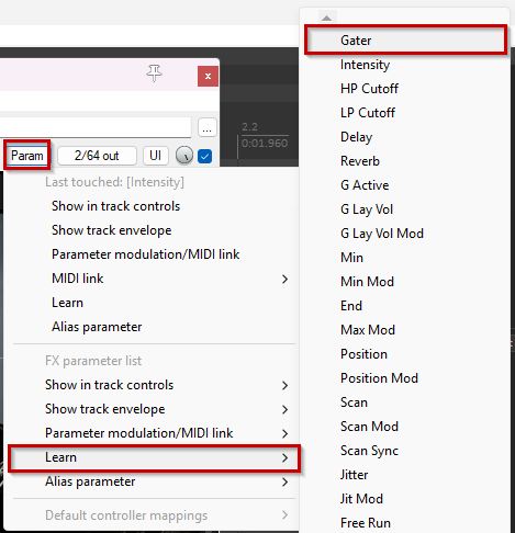 Nun wählen wir Param > Lern und sehen, dass Gater und Intensity noch nicht gemappt sind. Wir klicken zunächst auf Gater.